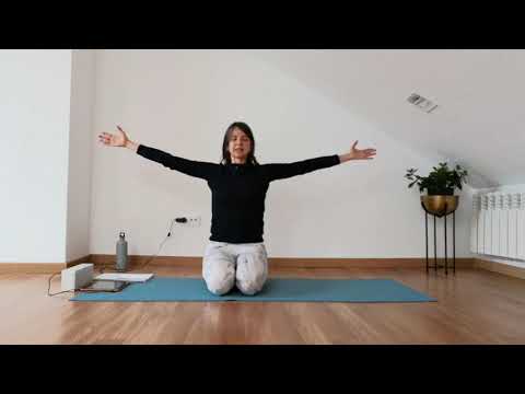 De nuevo sentados en postura fácil. Tómate de los hombros con los pulgares por detrás y los otros dedos hacia el frente. Los codos y la parte superior de los brazos están paralelos al suelo. Inhala mientras te inclinas a la izquierda. Exhala e inclínate a la derecha. Continúa este movimiento con respiraciones profundas durante 3 minutos. Luego, inhala al centro. Relaja.